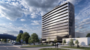Descripción: Renderizado arquitectónico de un edificio de oficinas con fachada curva de